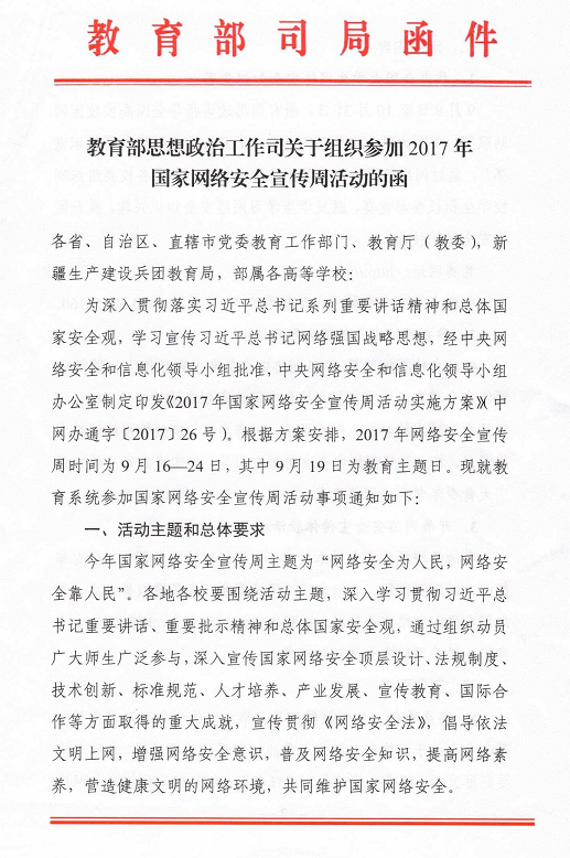 教育部思想政治工作司关于组织参加2017年国家网络安全宣传周活动的函