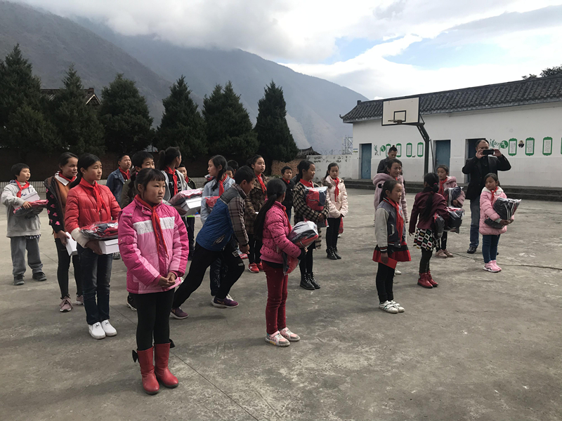 经过5小时的长途跋涉,中午时分校友会一行人到达目的地甘孜州泸定县磨西镇蔡阳小学。上山后刚踏入学校小巷,简陋整洁的小学、纯真善良的孩子、和蔼可亲的老师们一下映入校友眼帘。那质朴与热情足矣让你热泪盈眶。热情的欢迎介绍以后,校友们已经迫不及待想要把带来的礼物分发给孩子们。校友们将带来的物资清点按循序与尺码分发,孩子们的举动让我们感叹,是那么的井然有序,一个个的按照顺序站在那里,倾听着我们的呼喊。物资分发完以后,土木工程学院成都校友会李本华携自己的企业为4名特困学子送去贫困助学金。当校友们准备离开时,操场上突然想起来音乐“感恩的心’,原来这是孩子们为校友们准备的礼物,看着他们稚嫩的小手,简单干净但充满力量且温暖的动作,校友们不经忍不住都红了双眼。带去的关怀,让校友们收获的更是温暖,回荡于心的正能量,与净化心灵的感动。孩子们的那份阳光向上,坚韧,执着,拼搏,质朴。校友们给孩子们带来希望,相信他们也会给自己带来更美好的未来。
