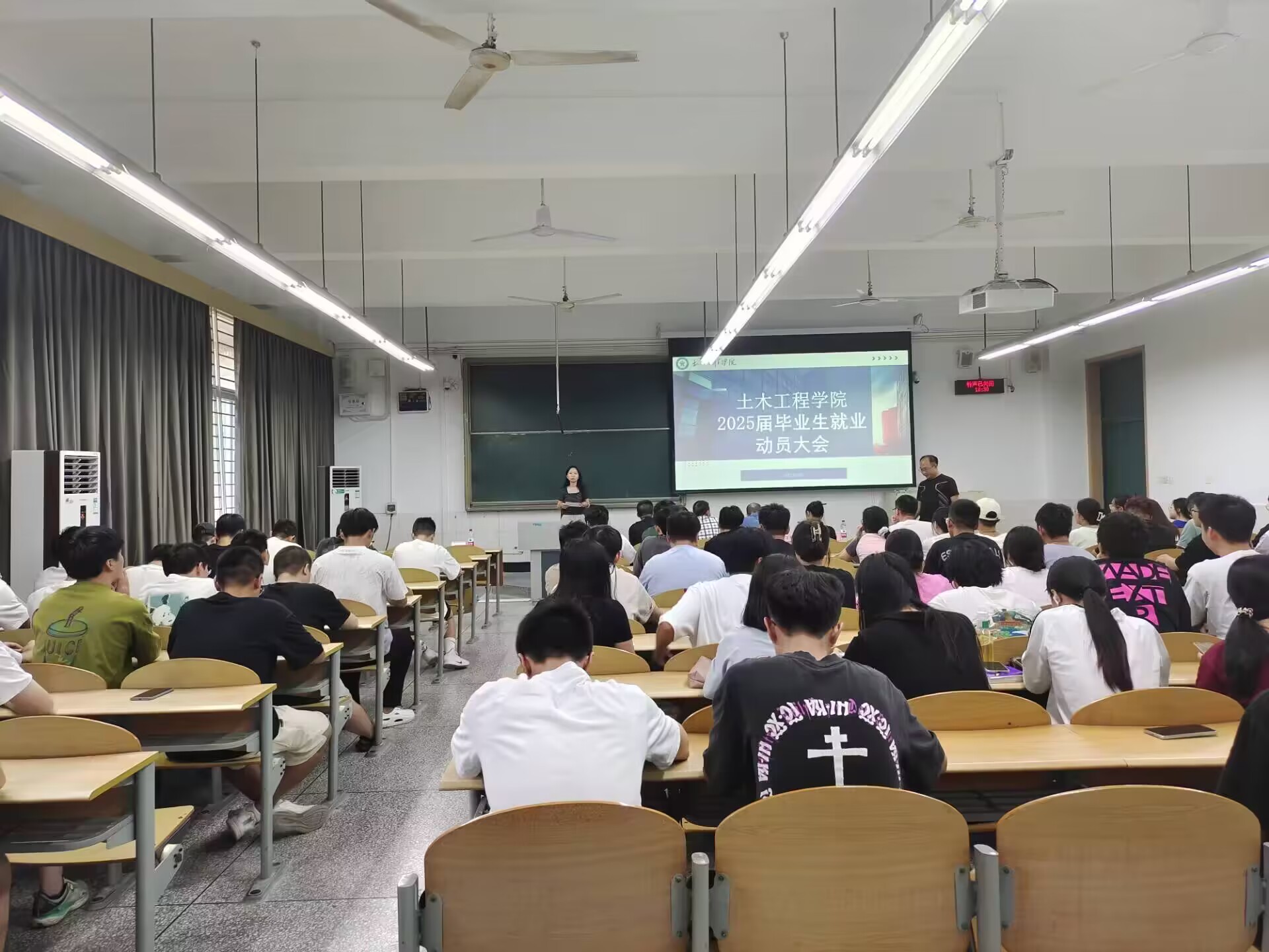 为使2025届毕业生充分认识当前的就业形势,调动毕业生的求职热情,切实促进毕业生更高质量就业,2024年9月11日至13日,土木工程学院分专业、分场次召开2025届毕业生就业动员大会。土木工程学院党委书记钟小兵,院长廖映华,副院长司马卫平,副院长刘文方,学工办副主任白宇,市政系主任唐恒军,土建系杨彦鑫,建经系吴黎明,学术办王海玥,毕业班辅导员以及全体2025届毕业生参加本次会议。