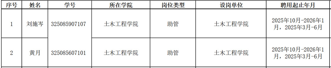 根据《四川轻化工大学研究生“三助一辅”工作管理办法》(川轻化〔2023〕63 号)、《关于开展2025-2026学年研究生“三助一辅”岗位申报工作的通知》,我院启动2025-2026学年研究生“三助一辅”岗位申报工作。经学生本人申请,学院组织面试,现将聘任结果公示如下。如有异议,请于10月4日17:00之前实名向2-311李进老师处反映,逾期不予处理。