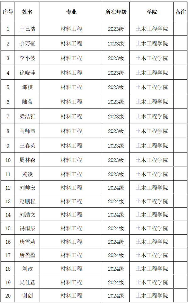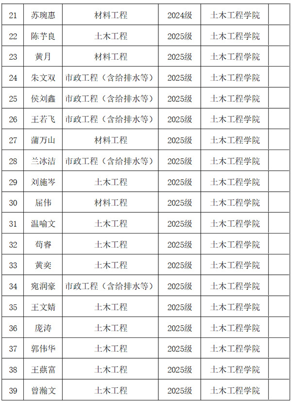 根据《四川轻化工大学关于做好2025年研究生国家奖学金、学业奖学金、助学金评审工作的通知》,经本人申请、民主评议小组复核、土木工程学院研究生资助工作评审委员会讨论通过,拟推荐获得国家助学金名单如下: