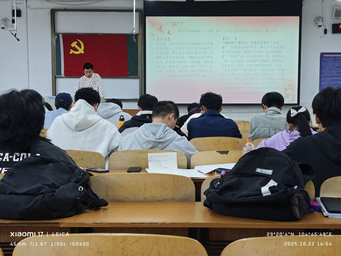 随后,唐景川同志结合习近平总书记给天津大学及中国农业大学全体师生的回信精神,号召大家聚焦国家战略需求,弘扬实干报国传统。 他还领学了《习近平谈治国理政》第五卷中“朝着建成教育强国目标扎实迈进”等内容。周桂民同志则围绕“抓铁有痕,踏石留印——‘社会主义是干出来的’”这一主题展开分享,强调党员要发扬“钉钉子”精神,以担当和本领将各项决策落到实处。同时,他带领党员学习了“四川党建网”党员学习参考清单内容。胡家强同志结合自身成长经历进行分享,呼吁党员们勇于抓住机会锻炼自我。