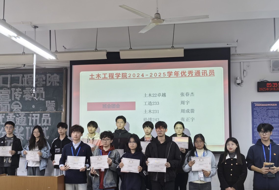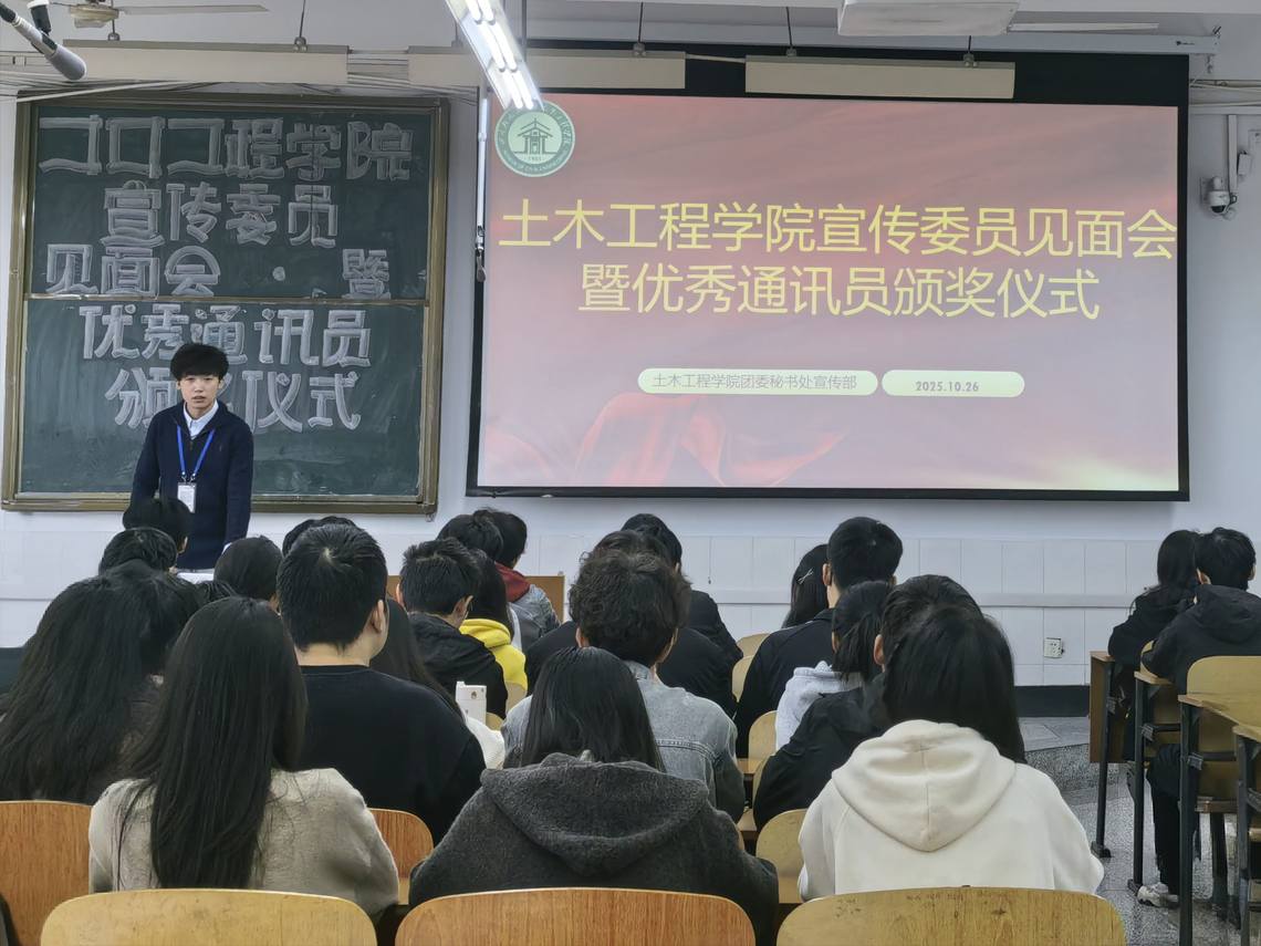 为更好地开展宣传工作、助力土木工程学院宣传事务高效推进,2025年10月26日上午9:30,土木工程学院团委秘书处宣传部在汇东校区N1-320举行宣传委员见面会暨2024-2025学年优秀通讯员颁奖仪式。学工办桂焱娥、各学生组织宣传部成员、全院班级宣传委员、参与了此次会议。