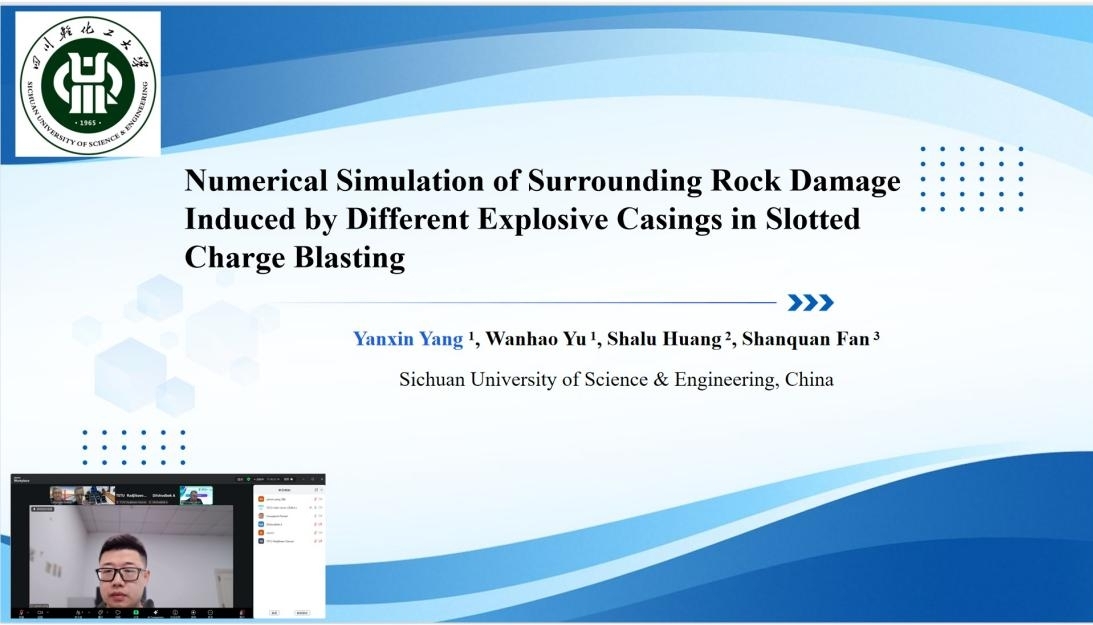 土木工程学院教师杨彦鑫应邀参会,并在线作了题为“Numerical Simulation of Surrounding Rock Damage Induced by Different Explosive Casings in Slotted Charge Blasting”(切缝爆破中不同药包外壳对围岩损伤的数值模拟)的学术报告。