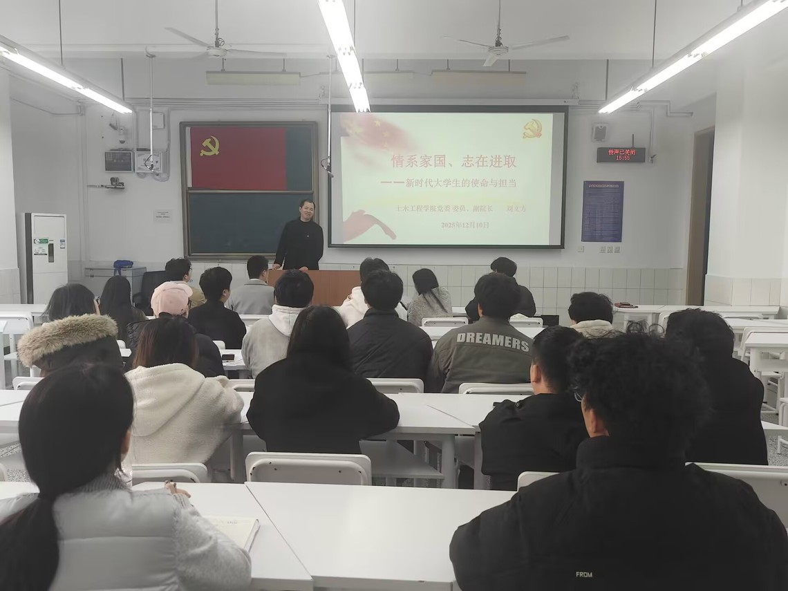 为深化全面从严治党、强化党员教育管理,2025年12月10日,土木工程学院学生第四党支部在厚德楼313教室举办“心系家国、志在进取”专题党课。党课由学院党委委员、副院长刘文方主讲,党支部全体党员及入党积极分子参加学习。