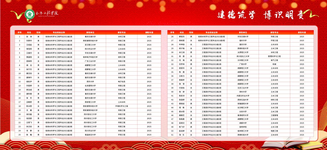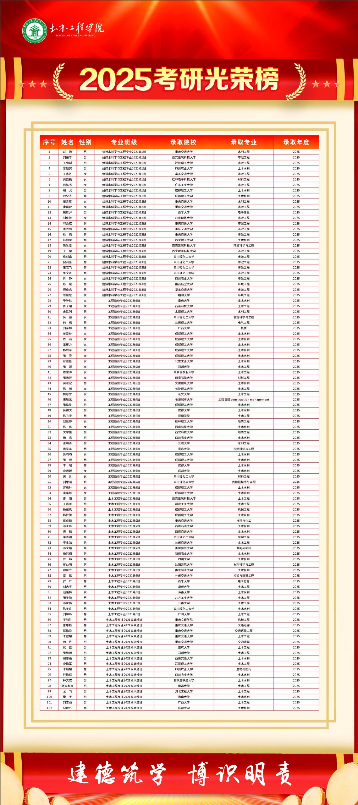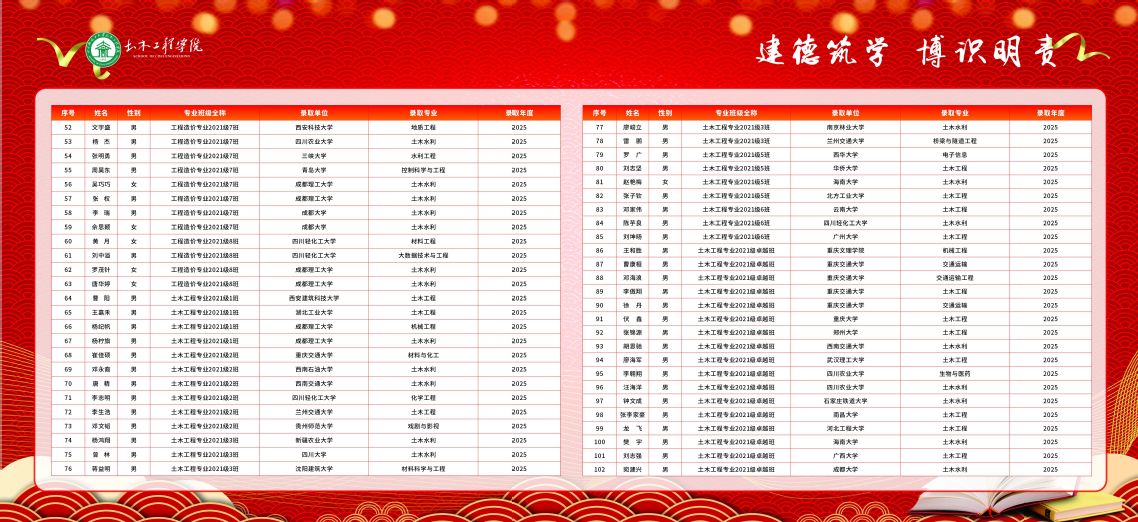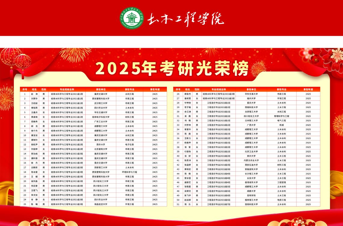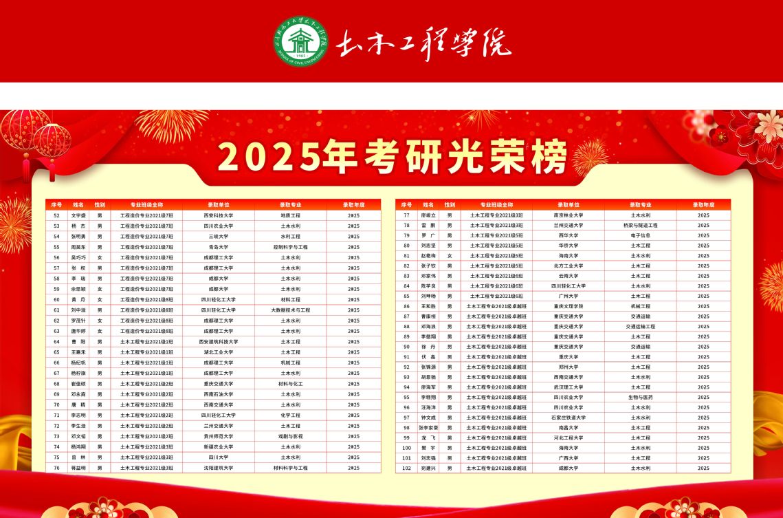 为充分发挥优秀集体、个人的榜样示范引领作用,激发同学们的学习热情与进取精神,营造浓厚学习氛围和良好育人环境,我院开展优秀集体、个人风采展示活动。本期带来“土木工程学院2025届毕业生研究生录取展示”,通过展现优秀考研学子的风采,鼓励土木的每一位学子都能以他们为标杆,砥砺前行,开创新的篇章!