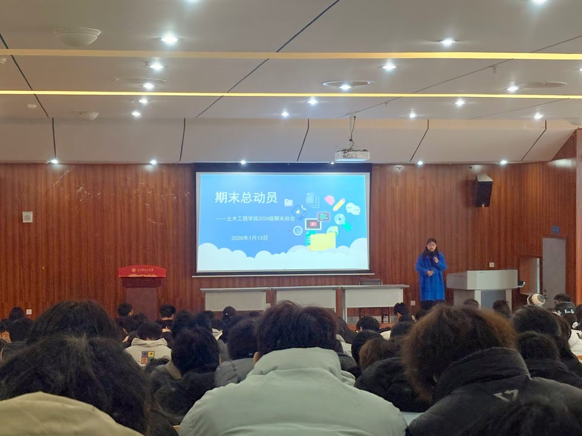 为切实做好期末各项工作,保障学生度过安全、充实的寒假,2026年1月13日上午,土木工程学院 2024级在汇东校区第四实验楼214教室召开“期末总动员”主题班会。土木工程学院 2024级全体学生参会,会议由辅导员桂焱娥主持。
