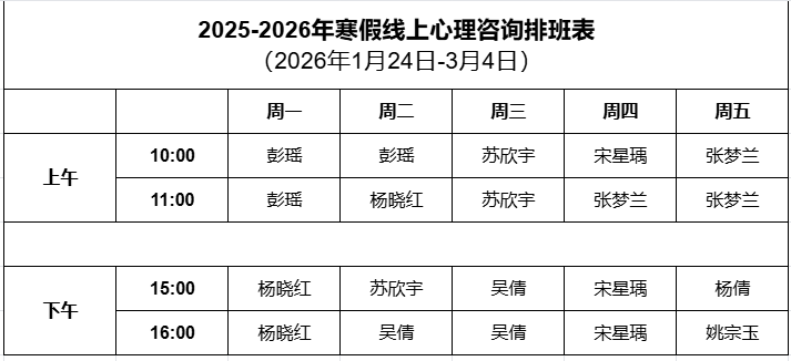 学校心理咨询于2026年1月24日至3月1日转为线上心理咨询,每周周一至周五均有老师排班,具体排班如下: