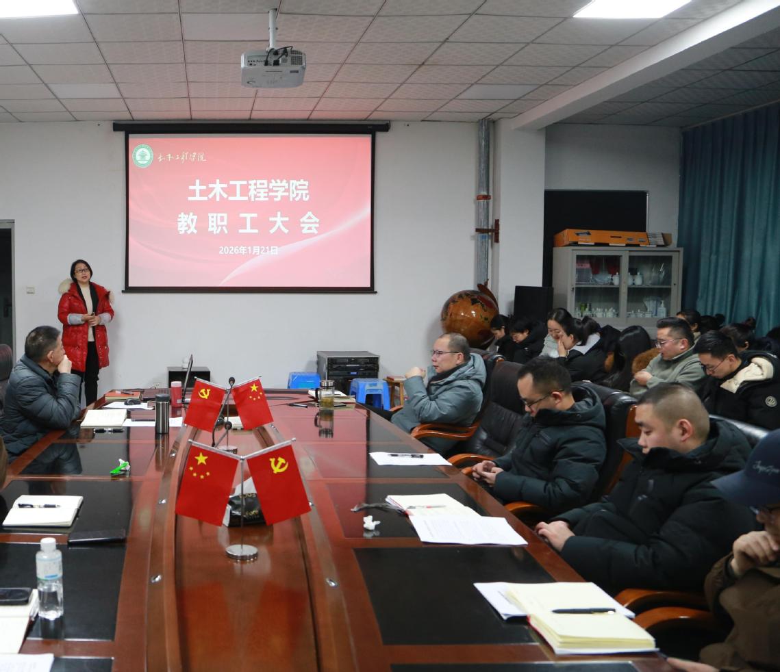 2026年1月21日下午,土木工程学院召开放假前全体教职工大会,全面总结2025年度工作成效,系统部署寒假及2026年重点任务。会议由学院党委书记朱德珍主持,全体教职工参会。
