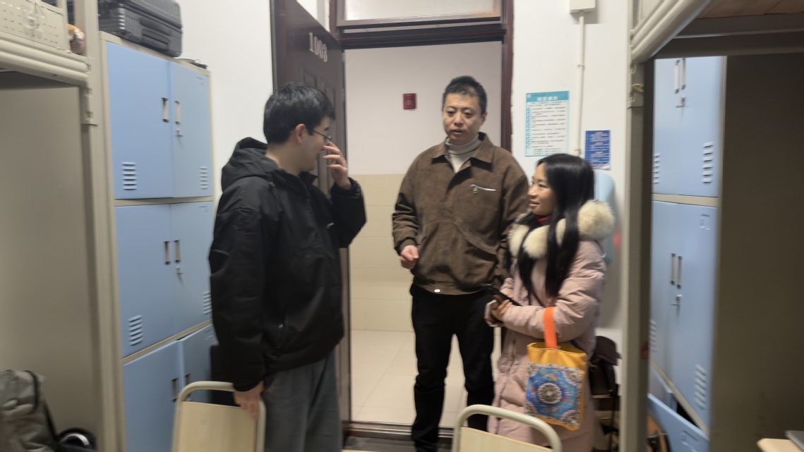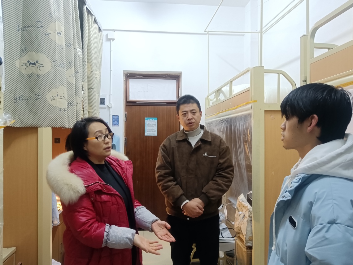 走访过程中,老师们逐一走进学生宿舍,与同学们亲切交谈,细致询问大家的返乡行程安排、行李准备情况以及假期计划,并认真听取同学们的实际需求与建议。结合寒假离校安全工作的要求,对宿舍内的电源线路、电器使用状况进行了仔细检查,现场提醒同学们离校前务必关闭水电、清理易腐食品和垃圾,妥善保管贵重物品,锁好门窗,杜绝安全隐患。