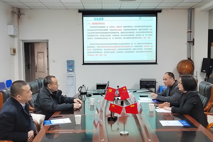 座谈会在汇东校区第三实验楼2号楼302会议室举行。会上,朱德珍代表学院对徐明建一行的到来表示热烈欢迎,并简要介绍了个人的基本情况。徐明建转达了富顺县委、县政府对朱德珍的诚挚问候与新春祝福,并表达了美好期许。随后,双方共同观看学校形象宣传片,直观了解学校的办学历史、学科建设、师资力量及育人成果。黄凯科长从招生政策、专业特色、录取规则、就业前景等方面展开招生宣传。