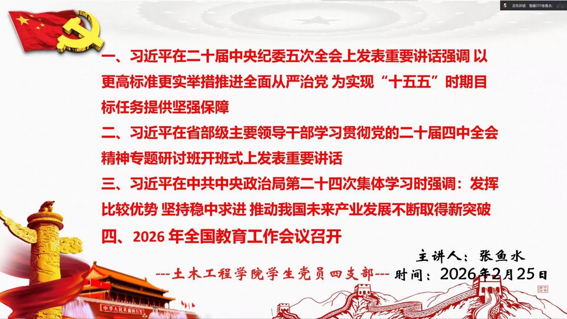 2026年2月25日下午,土木工程学院学生第四党支部通过腾讯会议召开二月线上党组织生活会,党支部全体党员及入党积极分子参加会议。会议由党支部组织委员唐艳同志主持。