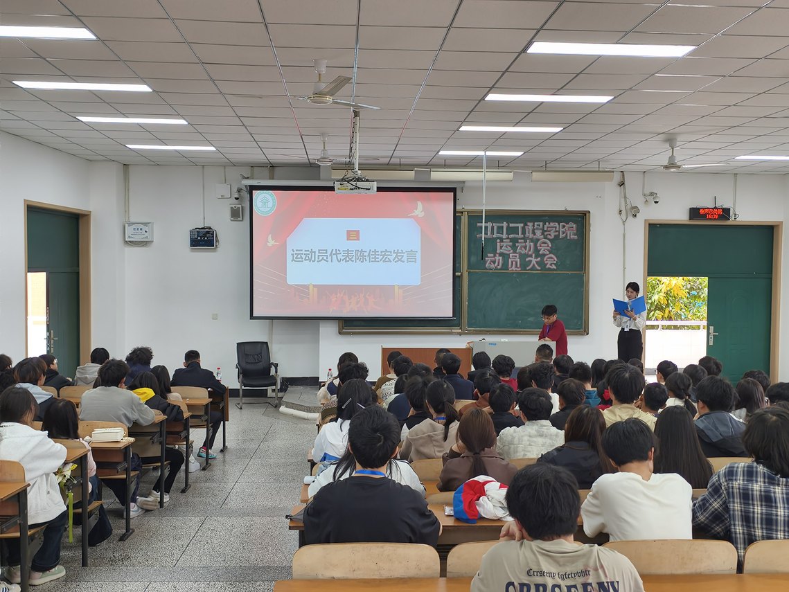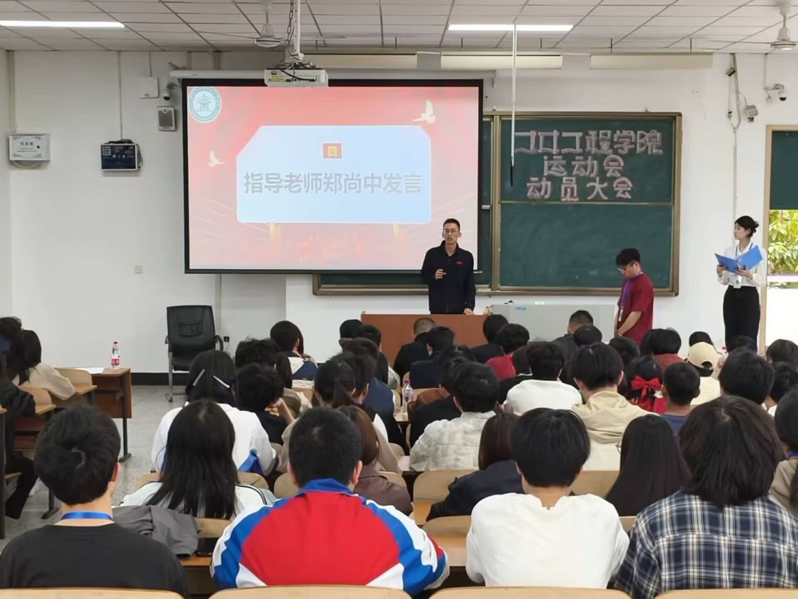 会上,与会人员共同回顾了学院往届校运会的参赛佳绩与拼搏风采。运动员代表陈佳宏上台致辞,并代表全体运动员承诺严守赛场规则、奋勇拼搏,以土木人攻坚克难的作风为学院争光。指导老师郑尚中对赛事安排、流程衔接、人员分工及注意事项作出具体部署,要求同学们科学备赛、劳逸结合,遵守规则、尊重裁判,注重安全、量力而行,团结协作、凝聚合力。孙振坤围绕赛事纪律进行了强调。他要求全体师生进一步强化大局意识,严格遵守比赛规则与赛场纪律,同时叮嘱同学们筑牢安全防线,如遇身体不适及时报备,以文明向上的精神风貌参与赛事。
